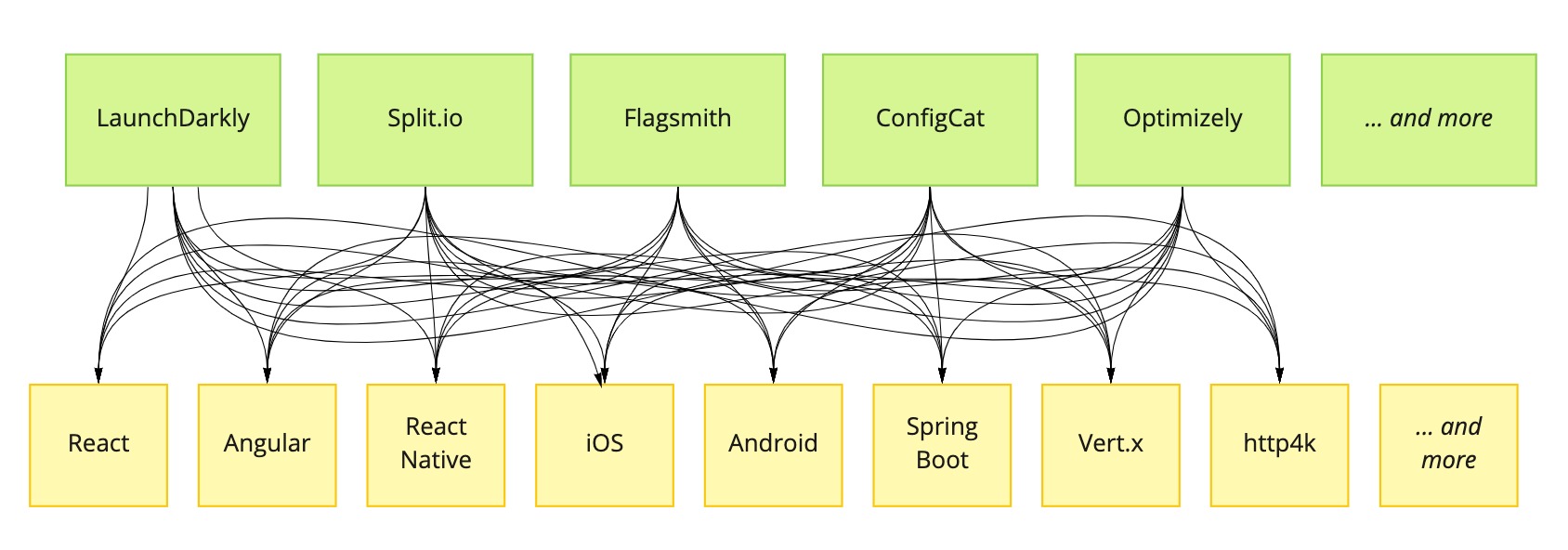 While most of the value of a flag management platform lies beneath the surface, each platform still has to provide that surface-level capability - the ability to evaluate a flag at runtime. And that ability needs to be available in each tech stack. So every flag management vendor ends up maintaining a small flock of feature flagging SDKs in various tech stacks. Even when we're just talking about glorified if statements, this is actually a lot of work, and it's work that is duplicated by each feature management platform.